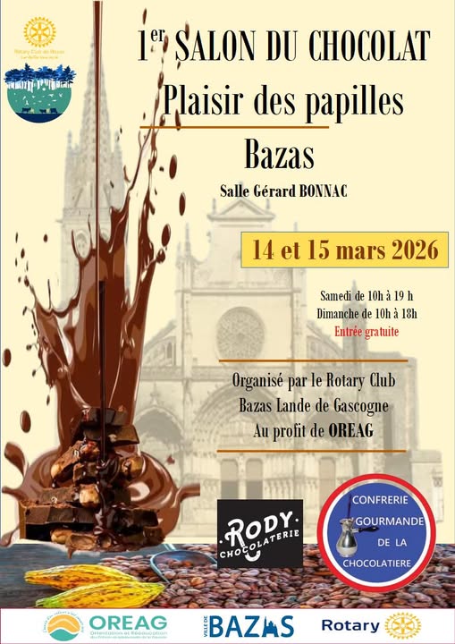 1er Salon du Chocolat à Bazas – Plaisir des papilles Le Rotary Club Bazas Lande de Gascogne organise le 1er Salon du Chocolat à la salle Gérard Bonnac de Bazas les :