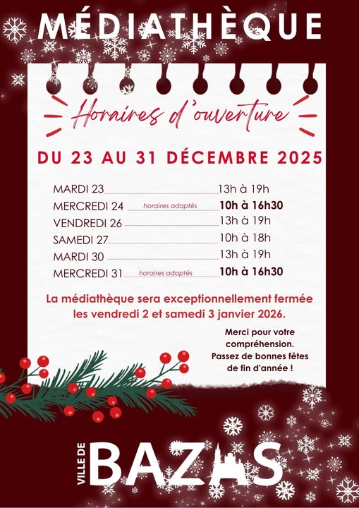 Exceptionnellement fermé : Les vendredi 2 et samedi 3 janvier 2026.
