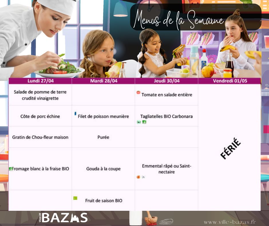 La Ville de Bazas vous informe des menus servis à l’école maternelle et élémentaire ,