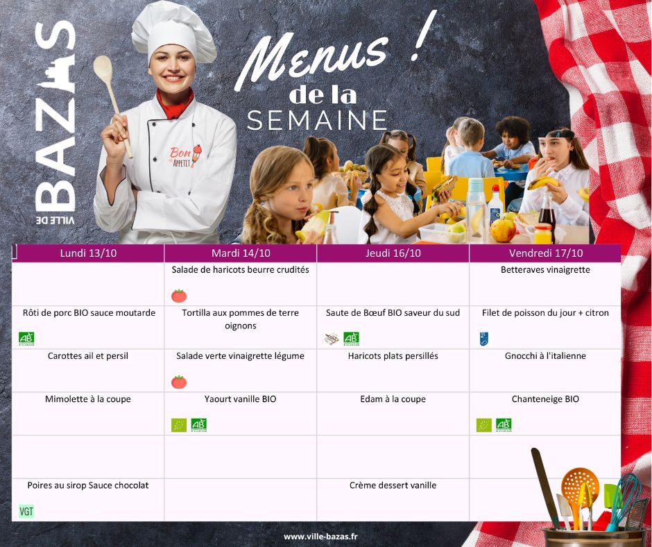 La Ville de Bazas vous informe des menus servis à l’école maternelle et élémentaire du 13 octobre au 17 octobre