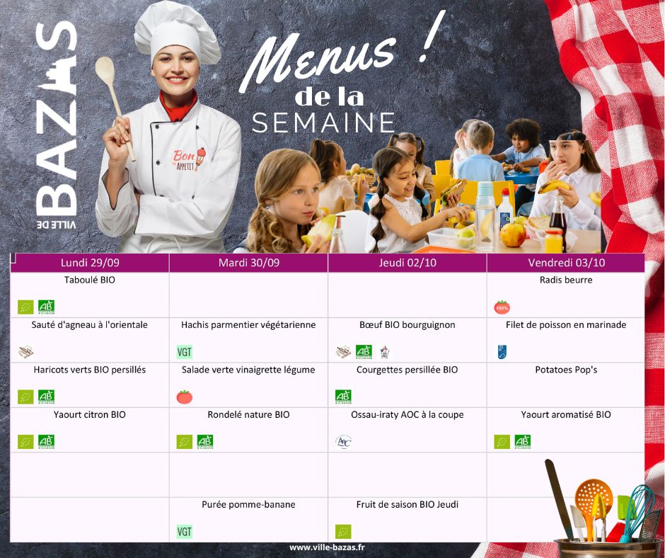 La Ville de Bazas vous informe des menus servis à l’école maternelle et élémentaire du 29 septembre au 3 octobre