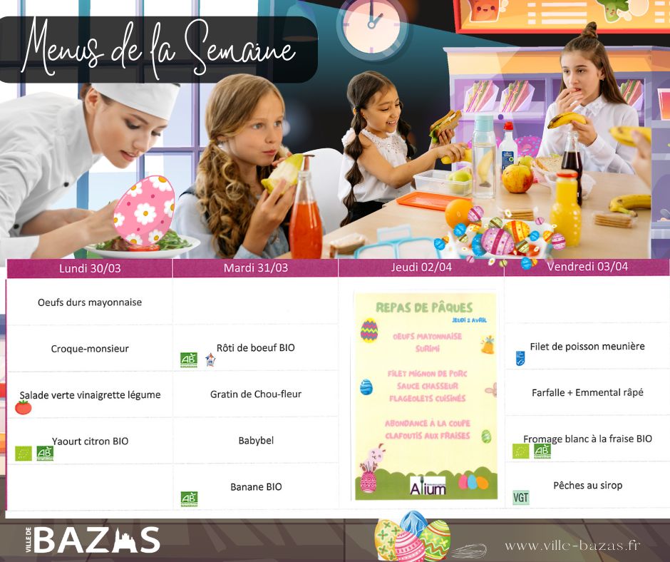 La Ville de Bazas vous informe des menus servis à l’école maternelle et élémentaire du 30 mars au 3 avril.