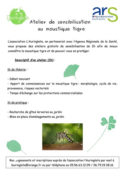 Ne laissez pas le moustique tigre s’installer !Participez aux ateliers GRATUITS de sensibilisation organisés par l’association L’Auringleta, en partenariat avec l’Agence Régionale de la Santé, ces ateliers de 2h vous permettront de :• Mieux connaître le moustique tigre• Comprendre les risques pour la santé• Adopter les bons gestes pour s’en protéger efficacement